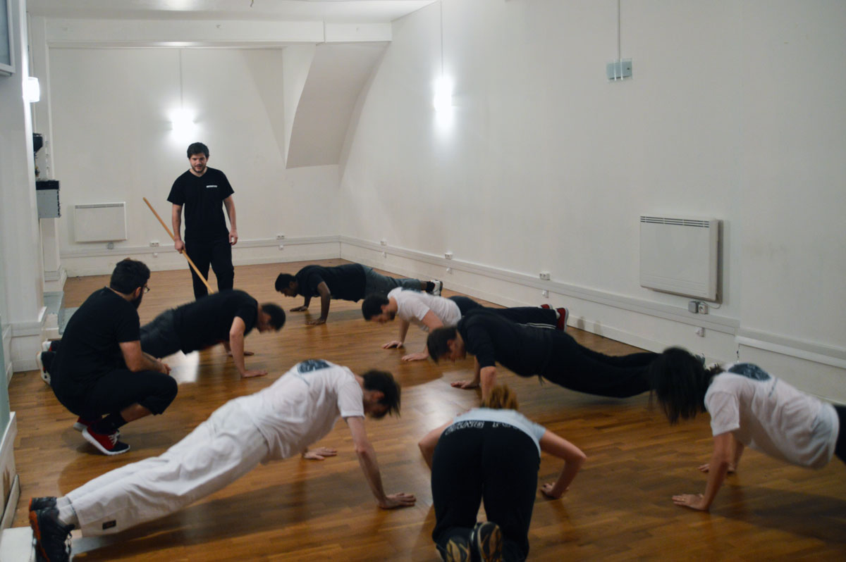 Les élèves arrivent, ils sont au maximum 14. Le cours commence par des échauffements et du renforcement musculaire (abdos, gainage).  C’est ensuite que cela devient plus intéressant, les élèves s’équipent de leur sabre laser, prêté par la Sport Saber League, et les instructions arrivent. Le cours porte sur des enchainements et des déplacements de jambes, rien à voir avec les saltos des jedis. Les professeurs, Nathan et Adrien, se déplacent dans la salle afin de corriger les postures et prodiguer des conseils. Au bout d’une heure, les élèves sont quand même crevés, et c’est le moment des étirements pour finir le cours.