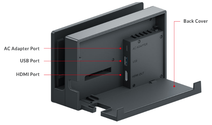 Tout d’abord, la console c’est la « tablette » qu’on voit. Les manettes se clipsent à droite et à gauche. Elle utilise des cartouches (format différent de la 3DS), et on peut lui adjoindre une microSD. Elle possède un pied à l’arrière qui m’a semblé de mauvaise qualité. Ce qui contraste avec la console et les manettes qui sont vraiment quali. Enfin, on retrouve un dock pour pouvoir la recharger et la connecter à sa TV.