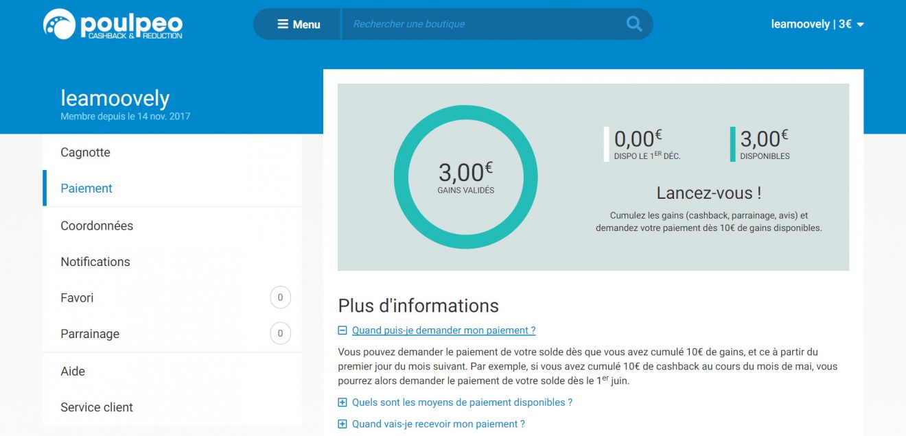 Le cashback, c’est une réduction sur ses achats qui s’applique après l’acte d’achat. Mais si c’est après, cela signifie que je paie le prix fort ? Oui, mais le montant de la réduction est crédité sur un compte et il est possible de virer une partie ou la totalité des sous présents sur ce compte vers son propre compte en banque. Allez, je vous explique exactement comment ça fonctionne et pour se faire, je vais prendre le site Poulpeo.com comme exemple.