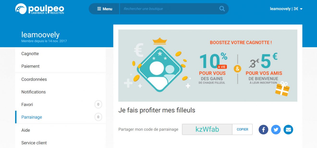 • Tout commence avec la création d’un compte sur la plateforme. Nous nous voyons immédiatement crédité de 3€. Un code de parrainage est aussi créé : on peut donc parrainer des amis qui deviennent des utilisateurs du site. Le petit plus assez incroyable c’est que chaque filleul se voit créditer 5€ dans sa cagnotte au lieu de 3€, mais en plus on touche 10% des gains de nos filleuls et ce, à vie ! Venez, cliquez sur mon lien de parrainage ! Au cas où les garçons ne m’offrent pas ma peluche licorne…