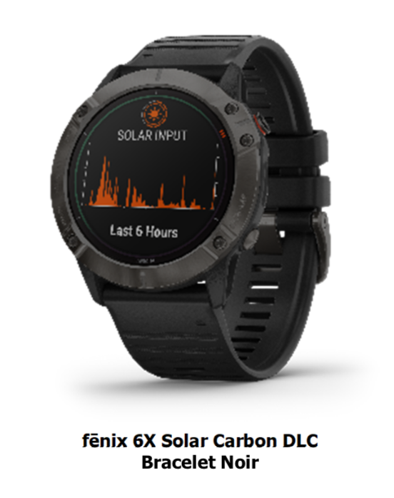 La fēnix 6X Pro Solar est la première montre GPS Garmin dotée de la technologie de chargement solaire Power Glass. Equipée d’un verre photovoltaïque transparent, la montre utilise l’énergie du soleil pour prolonger son autonomie. Un affichage dédié permet de vérifier rapidement le niveau de récupération de l’énergie solaire de la montre. Grâce à cette technologie unique, les utilisateurs peuvent désormais profiter encore plus longtemps de leurs activités, des fonctionnalités d’entraînement, de la cartographie en couleur ou bien encore de la musique en streaming. La performance de la batterie de la fēnix 6X Pro Solar en mode montre connectée est de 21 jours, plus 3 jours supplémentaires en utilisant les capacités de chargement solaire.