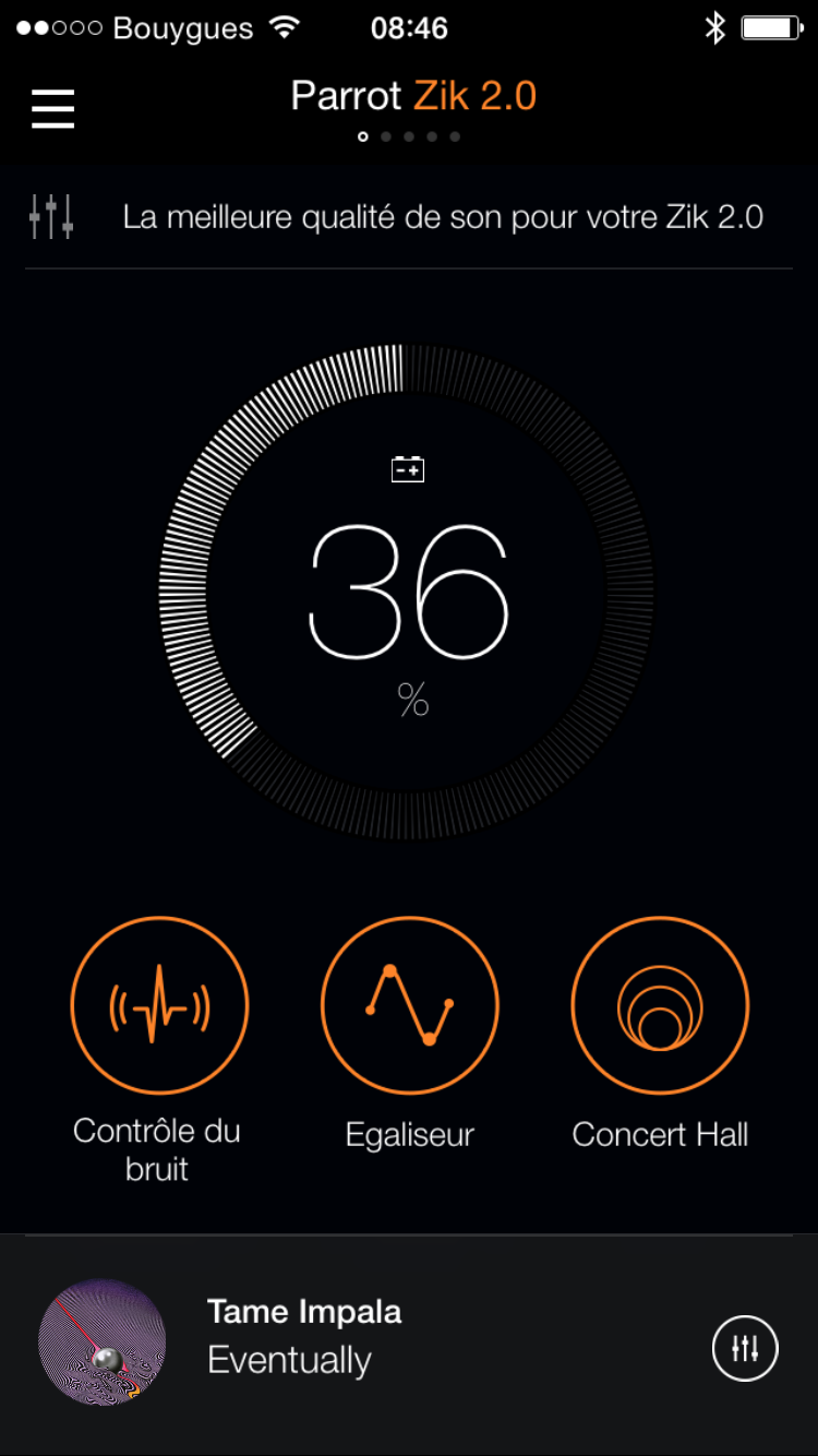 Pour profiter du casque, il faudra bien évidemment utiliser l’application Parrot Zik 2.0 disponible sur Android et iOS. Elle permet de régler la réduction de bruit, d’égaliser le son, et de faire des réglages ou bien d’utiliser ceux d’artistes partenaires. L’application reflétera la couleur de votre casque (dans notre cas orange) mais il est possible de changer ce paramètre afin d’avoir une application plus lisible. T