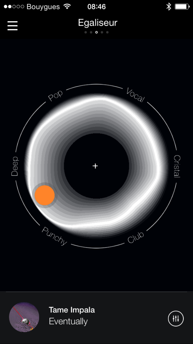 L’application, un peu compliqué de prime abord, est pour moi ce qui fait la très grosse valeur ajoutée du Zik 2.0. Outre le fait de vous donner le pourcentage restant de batterie, elle vous donne aussi accès à un égaliseur « visuel » hautement pratique. Vous déplacez dans un cercle un point entre « deep », « punchy », « cristal », « club », « vocal » et « pop » afin de modifier les bandes de fréquences de la musique que vous écoutez. Le fait d’avoir donner des noms et de déplacer un point sur un cercle est très pratique. Je suis pour ma part à fond au bord du cercle entre deep et punchy.
