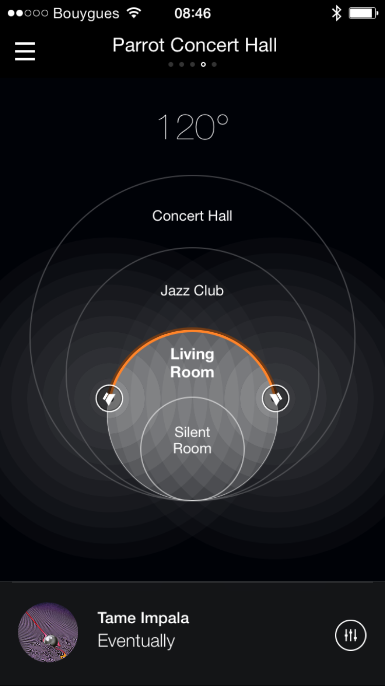 L’option Parrot Concert Hall permet de simuler la réverbération que nous aurions dans tel ou tel type de salle. Le « living room » me convient parfaitement.