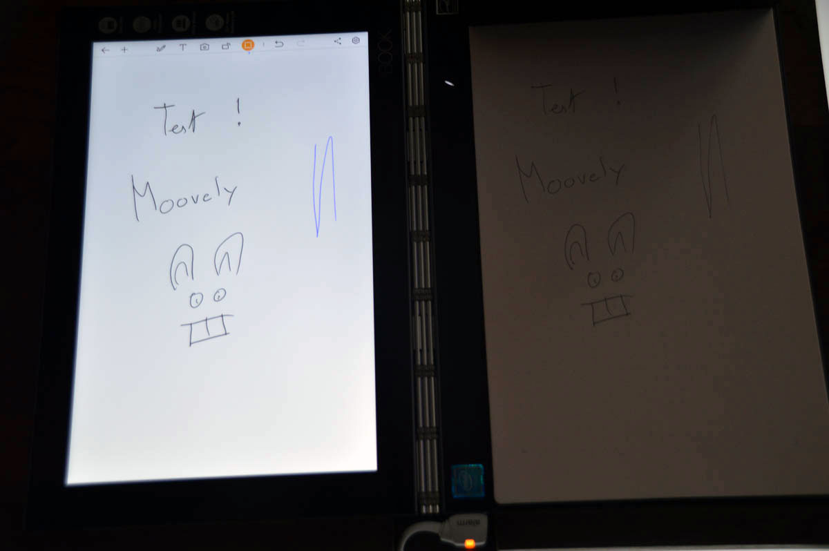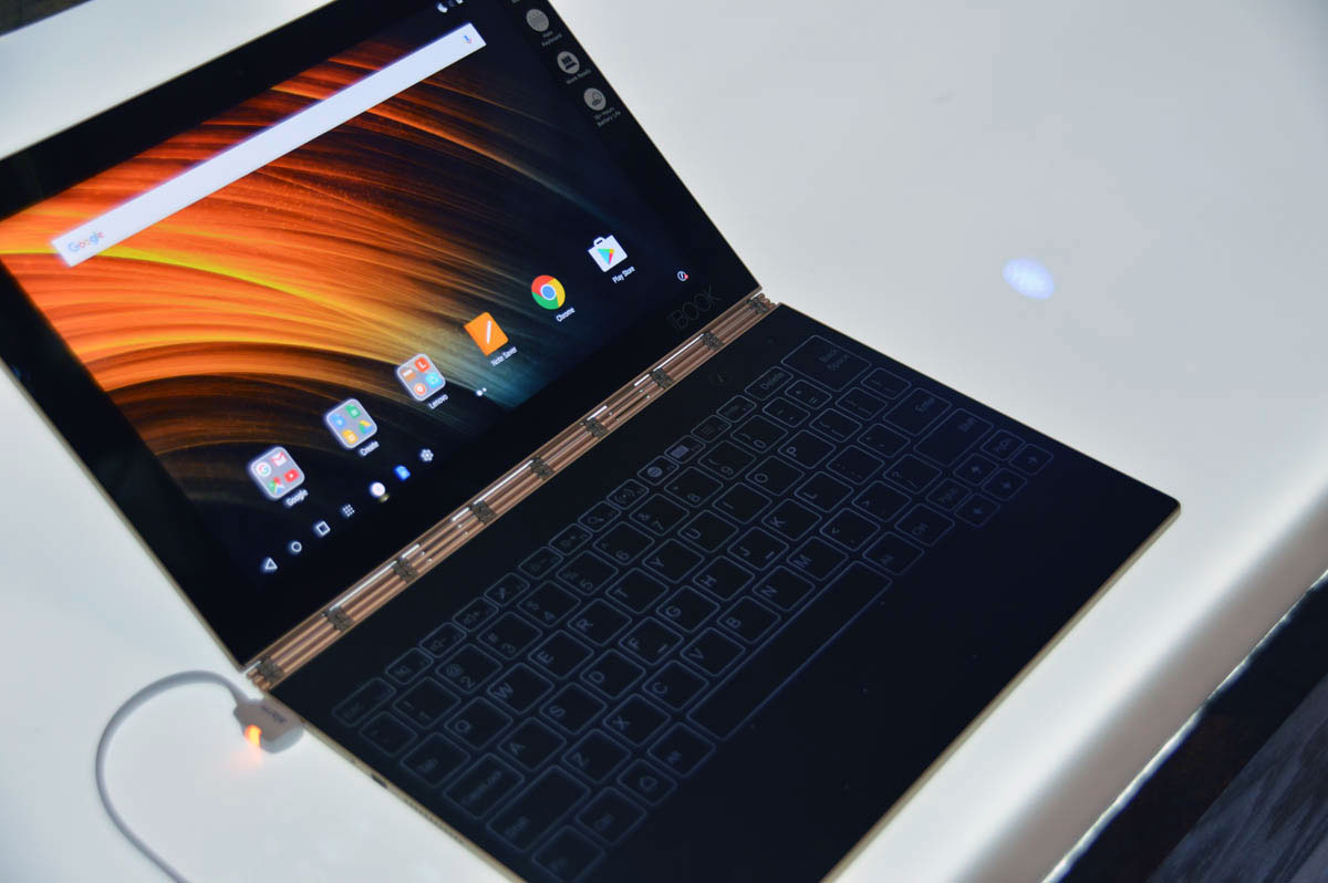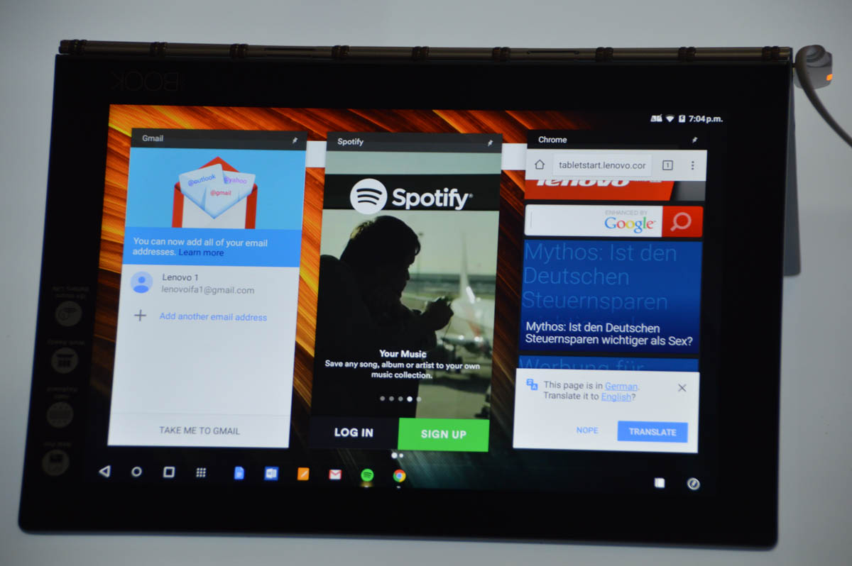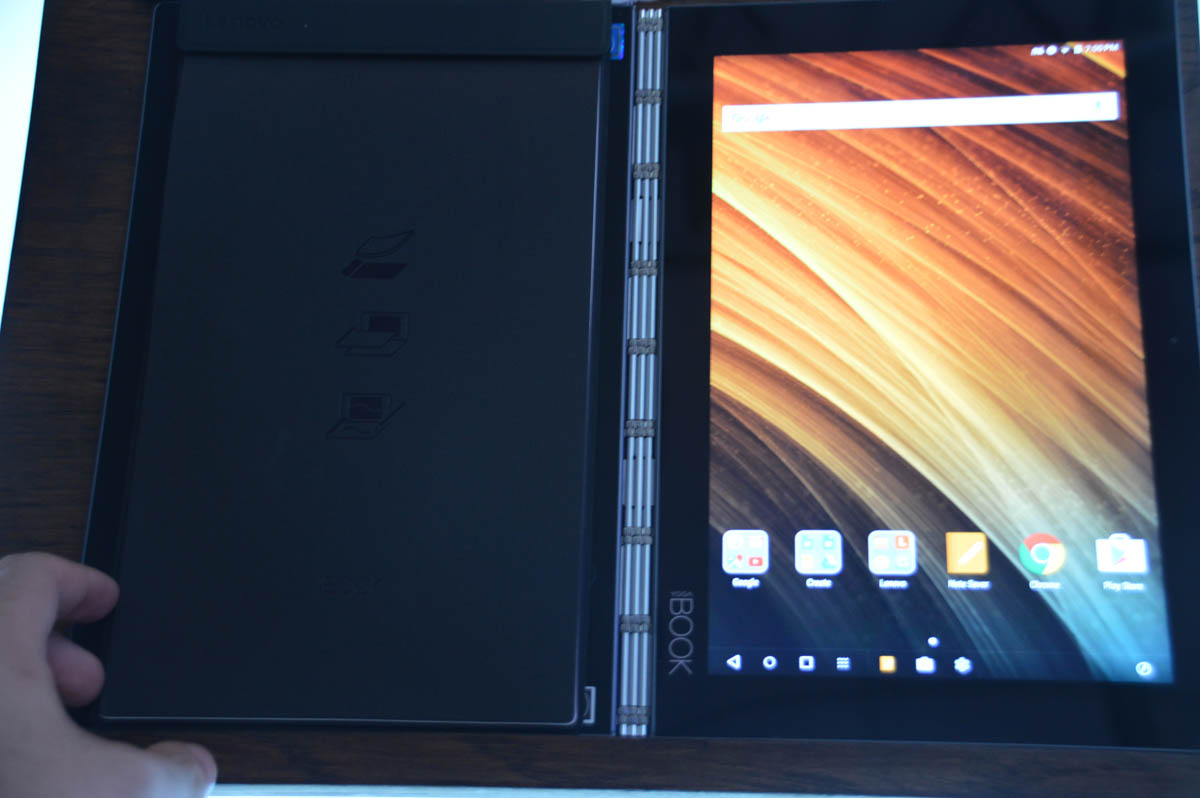 Même si le marché de la tablette est en berne, Lenovo souhaite innover et c’est réussi. On retrouve une tablette avec son écran, et une surface qui fait apparaitre un clavier haptique. On peut aussi s’en servir comme d’une tablette graphique. L’autonomie annoncée est de 15h sous Android et de 10h sous Windows car oui elle sera proposée sous les deux OS (400 euros sous Android et 500 sous Windows 10). Malgré qu’elle ne soit que sous Android 6.0, on retrouve la possibilité de redimensionner les fenêtres et un multitâche comme ce qu’on retrouve sous Windows. La tablette est légère et fine.