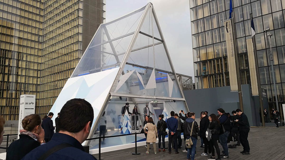 Dans un décor alpin, les participants vont pouvoir chausser des skis ; puis, muni d’un Gear VR, connaître le vertige d’un saut à ski spectaculaire et d’un slalom entre les sapins. Un vent froid (soufflerie et climatisation d’air froid) accompagne leur descente virtuelle et accentue la sensation de vitesse.