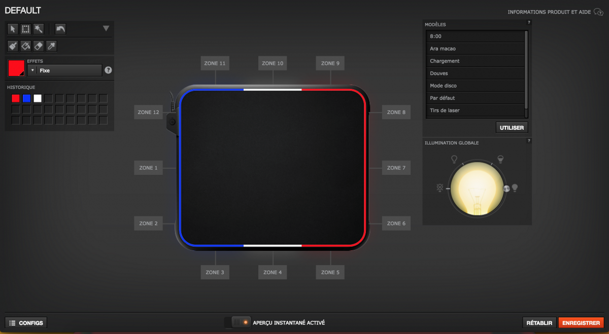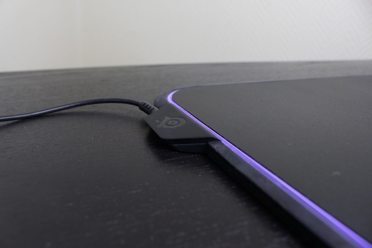 De plus, le rétroéclairage (tout comme sur la souris) est personnalisable via le logiciel SteelSeries Engine 3. La barre lumineuse qui entoure le tapis est composée de 12 parties, toutes modifiables individuellement. Le tapis peut aussi se synchroniser avec les trois jeux compatibles. Si vous manquez de munitions par exemple, il se met à clignoter pour vous indiquer qu’il faut recharger. Il est clair que c’est un petit plus et ce n’est pas cette dernière fonction qui pousserait quelqu’un à acheter ce tapis.