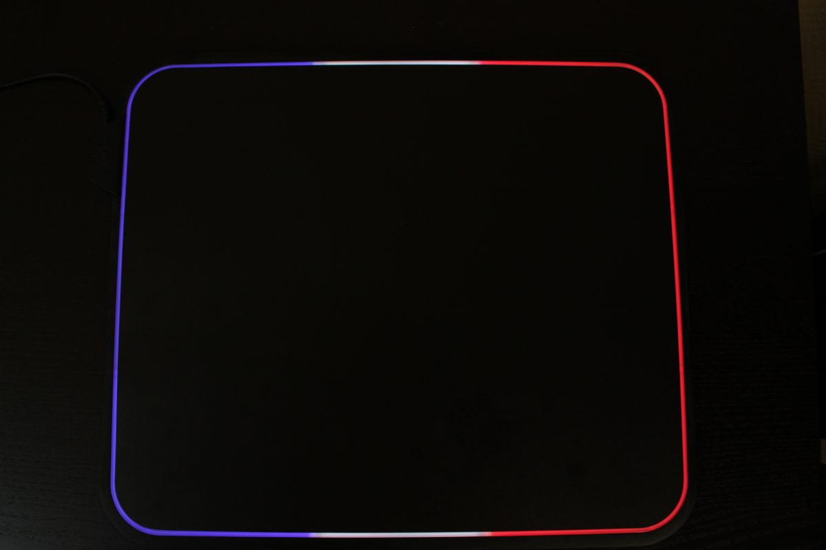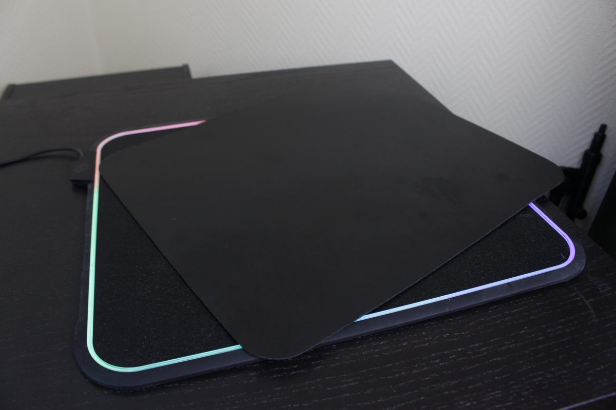 Quand je l’ai eu entre les mains, je dois vous avouer avoir été impressionné par le design. « Whoua » ai-je même pensé. Le tapis de souris en jette, le rétroéclairage est magnifique et, associé à la souris, on obtient un setup très très propre. Le tapis est grand, 356,71 x 292,4 x 8,68 mm et il dispose de deux surfaces de glisse : une en tissu pour un contrôle précis et une autre en polymère pour des jeux de vitesse. Il se raccorde en USB à l’ordinateur.