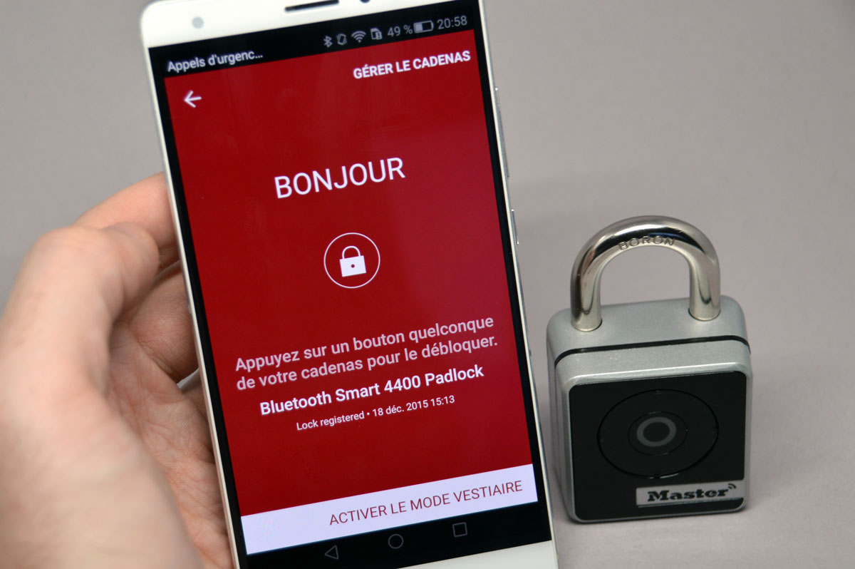 L’avantage de ce cadenas connecté, c’est qu’on n’a pas besoin d’apprendre la combinaison par cœur. Une fois le cadenas à portée du téléphone, il suffit de lancer l’application et d’appuyer sur le bouton du cadenas. Un petit clic et la lumière devient verte afin de nous dire qu’il est déverrouillé et qu’on a 5 secondes pour ouvrir sinon il se verrouille. Au cas où vous êtes dans une salle de sport avec votre smartphone sur vous ou dans votre casier, vous pouvez activer un mode « vestiaire ». Il faudra rentrer la combinaison ou désactiver ce mode sur le smartphone pour pouvoir le déverrouiller. Pratique pour éviter les cas de déverrouillage non désiré.