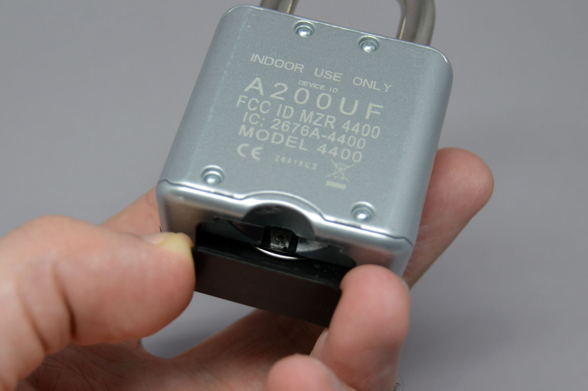 Le cadenas de Master Lock est assez imposant et lourd. On sent qu’on ne va pouvoir le casser facilement. Il n’y a pas de clé, mais une combinaison à effectuer en appuyant sur les bords du cercle (haut, bas, gauche, droite). Ca fait ressembler à un code Konami et d’ailleurs, il ne faudra pas perdre la notice puisque la combinaison est collé en haut à droite de celle-ci. Le centre s’illumine en bleu (normal), vert lorsqu’il est déverrouillé et rouge si vous n’avez pas fait la bonne combinaison. Il utilise une pile bouton et la trappe n’est totalement accessible que si le cadenas est déverrouillé.