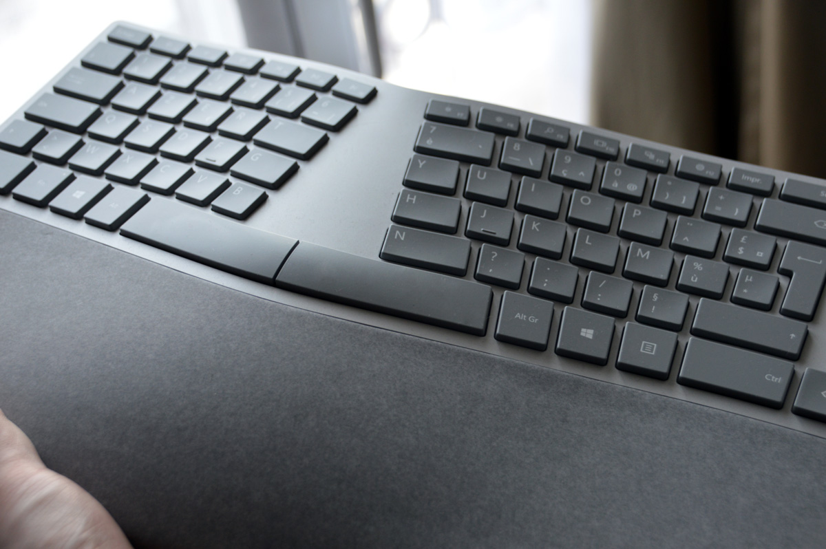Quand on regarde le clavier de plus près, on voit que certaines touches sont plus grandes que d’autres. On a aussi quelques raccourcis sur le dessus qui vont bien avec Windows 10 (genre Cortana ou afficher les différentes applications). Le clavier est donc complet. Cependant, on place différemment ses mains. Plus besoin de bouger, on les place une fois pour toute. C’est là que la magie opère. Déjà, le repose-poignet en alcantara est très agréable au toucher. Ensuite, ne plus avoir à bouger les poignets et à les tordre, cela permet de se reposer et de pouvoir enchainer des longues sessions d’écriture.