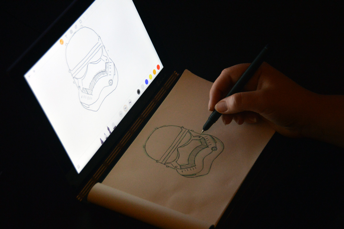 La Lenovo YOGA Book est particulière quand on la regarde. Elle fait plus petit notebook que véritable tablette. Elle se replie sur elle-même, on peut l’installer en mode tente, ou pour visionner des films, bref comme les autres appareils YOGA. C’est sympa et ça permet de l’utiliser un peu comme bon nous semble. Le passage au mode dessin ou clavier se fait via un bouton et la réactivité est au rendez-vous.