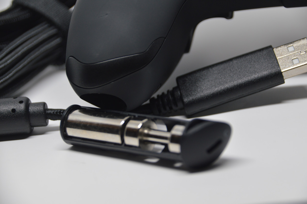 D’abord, le packaging. Très propre, sans être excessif la boîte contient la manette, le câble, une jolie pochette de transport pour y ranger la manette une fois notre session de jeu terminée mais également une petite clé qui permet d’ouvrir un compartiment de chaque côté de la manette afin d’y placer des poids (également fournis dans la boîte bien entendu) et nous laisse la possibilité de régler le poids de la manette comme on le souhaite. Très bonne idée je trouve. Personnellement j’ai besoin d’avoir une manette lourde dans les mains mais d’autres joueurs eux ne le souhaitent pas et c’est une très bonne idée de laisser le choix à l’utilisateur de régler à sa convenance ! Bien vu !