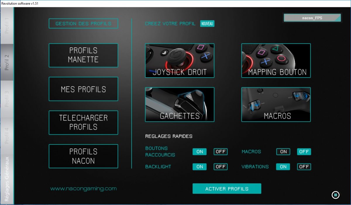 Petit bémol tout de même, si vous voulez changer de profil car les 2 présents sur le pad ne vont pas (vous pouvez en stocker 4 différents sur la manette et autant que vous voulez sur le PC), il vous faudra obligatoirement passer par le logiciel et brancher votre manette à l’ordinateur. Ça n’a pas l’air d’être très contraignant à première vue mais si vous emportez votre manette chez un ami et que vous ne disposez pas du bon profil sur votre pad, il vous faudra tout paramétrer… Je préfère vous le dire car cela m’est arrivé et c’est du temps de perdu à ne pas pouvoir profiter avec ses amis de cette très bonne manette qu’est la Nacon Pro Controller 😉
