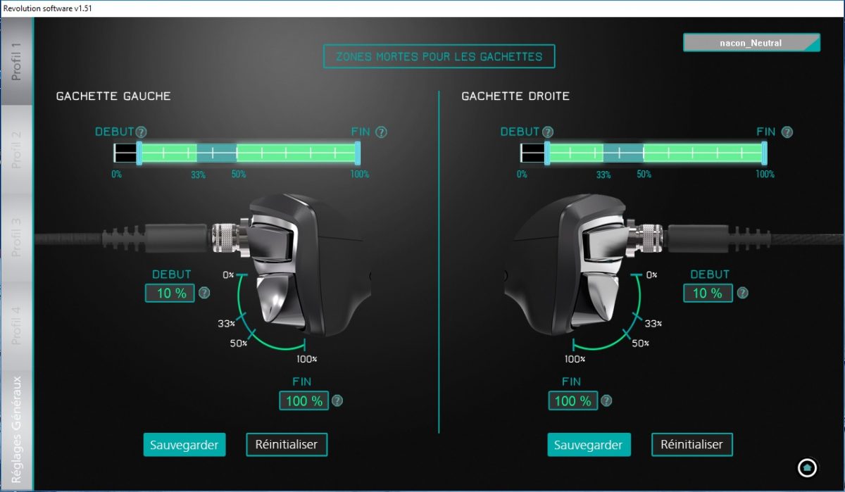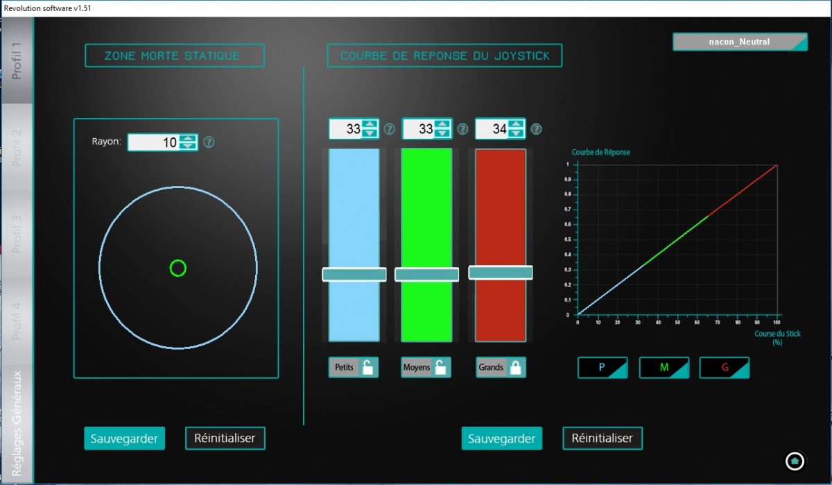 N’y allons pas par 4 chemins, j’ai été bluffé par les possibilités de paramétrage de la manette. On peut absolument tout régler selon notre désir et notre confort de jeu sous réserve bien entendu de prendre du temps pour le faire et s’y connaître un tant soit peu à ce type de réglage poussé.