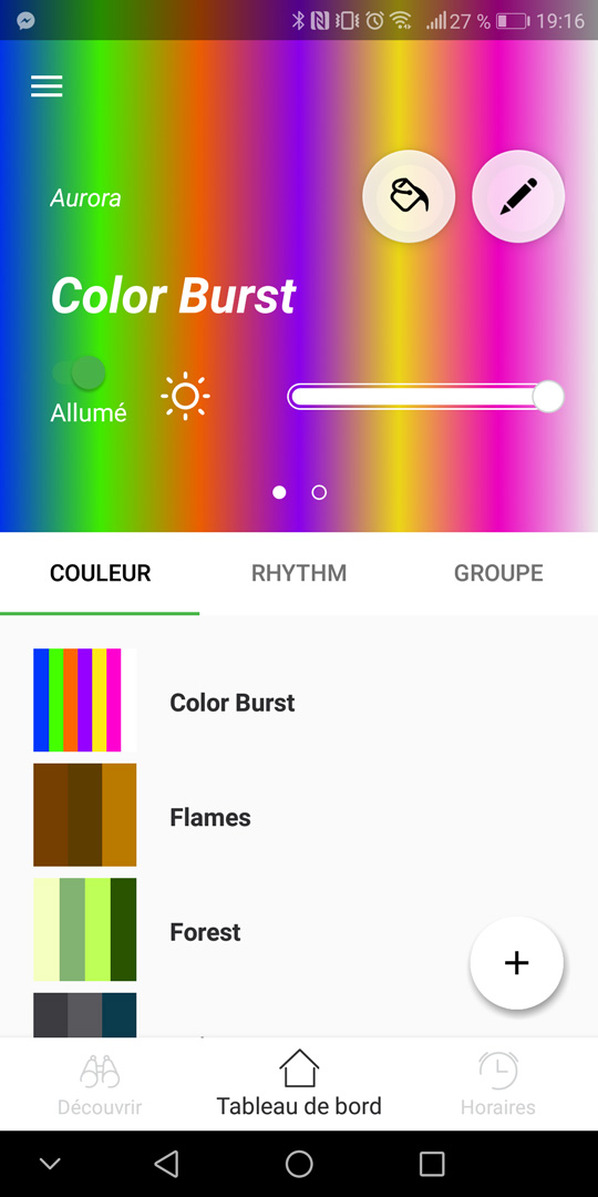 Non content de proposer des lumières qui se gèrent depuis son smartphone, Nanoleaf propose depuis peu le Rythm. Il s’agit d’un petit module (60€) à brancher n’importe où sur votre structure afin de pouvoir faire réagir les lumières au son ambiant. Là encore des presets sont disponibles et vous pourrez bien évidemment en créer. L’application a reconnu immédiatement que j’avais branché le Rythm et après un tutoriel assez simple, me voilà en train de monter le son pour kiffer l’éclairage à faire rougir le Faust. On peut l’activer en appuyant dessus ou via l’application. Il possède aussi une sortie Jack afin de recevoir la musique sans le bruit ambiant généré par vos amis (oui mes potes ont gueulé pour tester cette « lumière de ouf »).