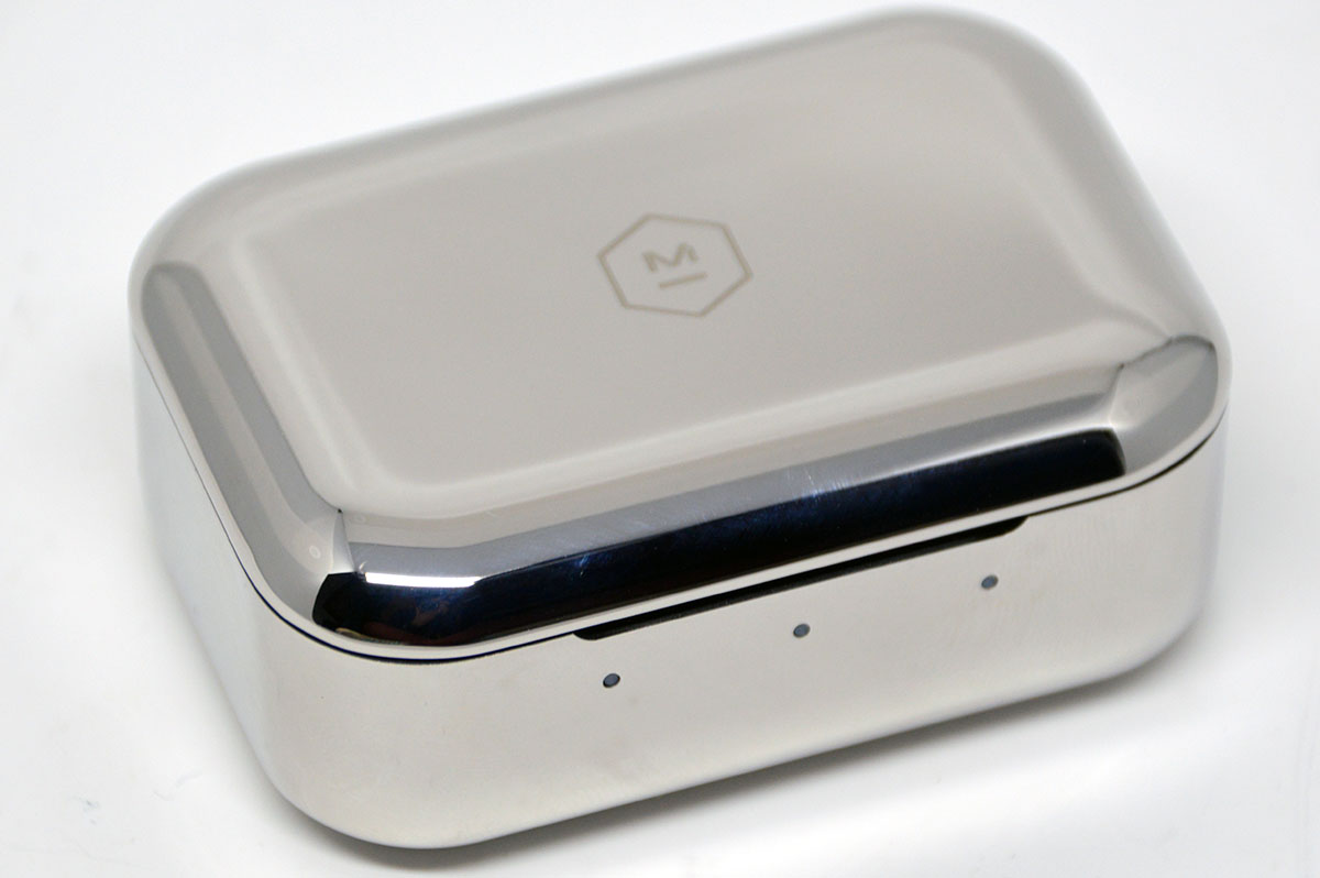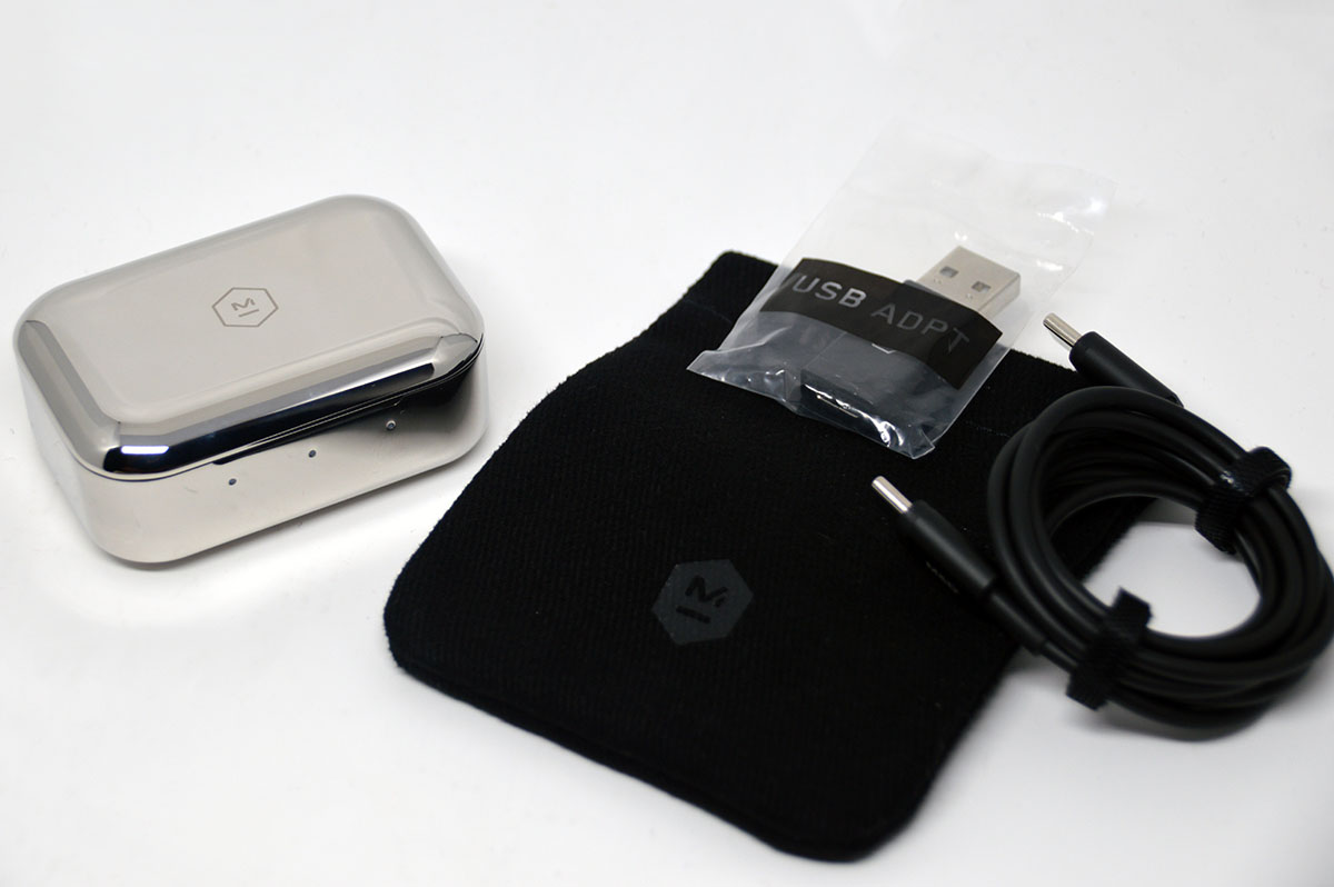 Ce qui frappe en ouvrant la boîte, c’est bien évidemment le design des écouteurs et de la boîte de transport. Commençons par le boîtier de charge qui est en acier, il est lourd et très brillant. On retrouve 3 LEDs pour indiquer la charge du boîtier et des écouteurs et enfin un port USB Type-C pour le charger. Dommage, vos doigts lui retireront sa beauté rapidement. Heureusement, une pochette est fournie avec, mais au bout d’un mois d’utilisation, nous l’avions déjà abîmé…