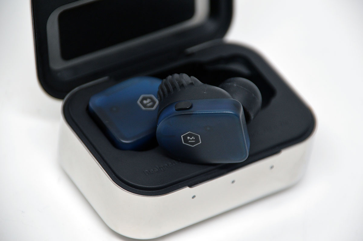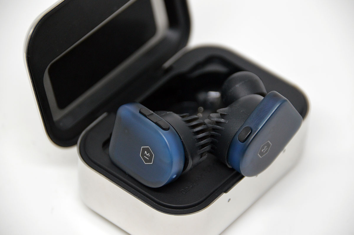 Passons aux écouteurs, je n’aime pas spécialement les AirPods d’Apple, mais Master & Dynamic nous propose un design très différent faisant appel à de l’acétate. Ils sont ainsi presque uniques du fait de leur finition. On retrouve des boutons sur le dessus de chaque écouteur pour gérer notre musique. Un système propriétaire permet de tenir les écouteurs dans nos oreilles sans difficulté.