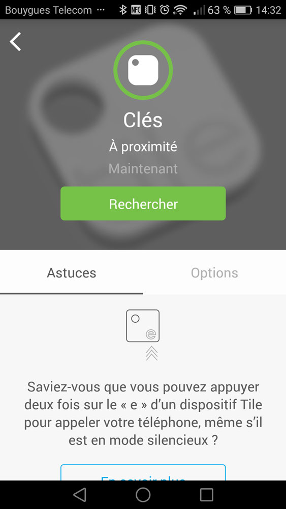 Le Tile Original possède un trou afin de l’accrocher à ses clés via un anneau. Sa taille le rend passe-partout. Pour lancer la recherche du smartphone, il suffit d’appuyer 2 fois sur le « E ». C’est très simple au final 🙂