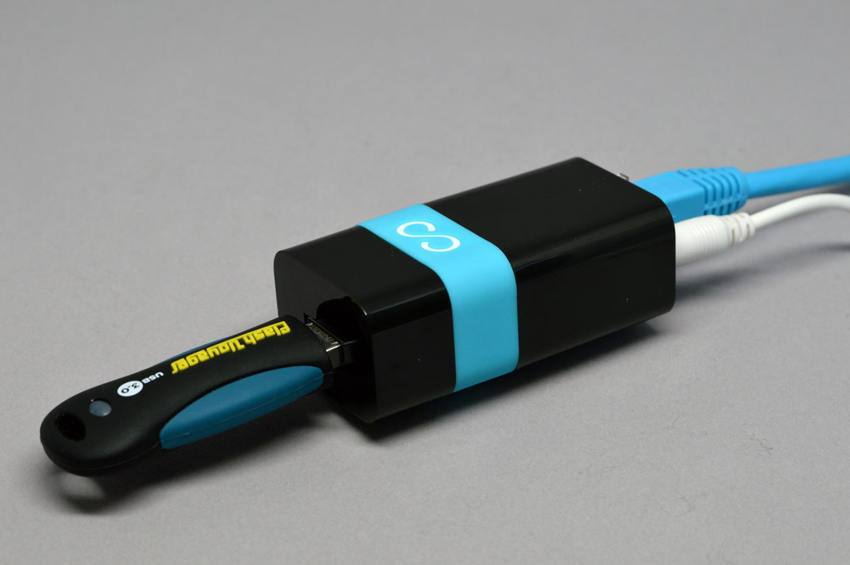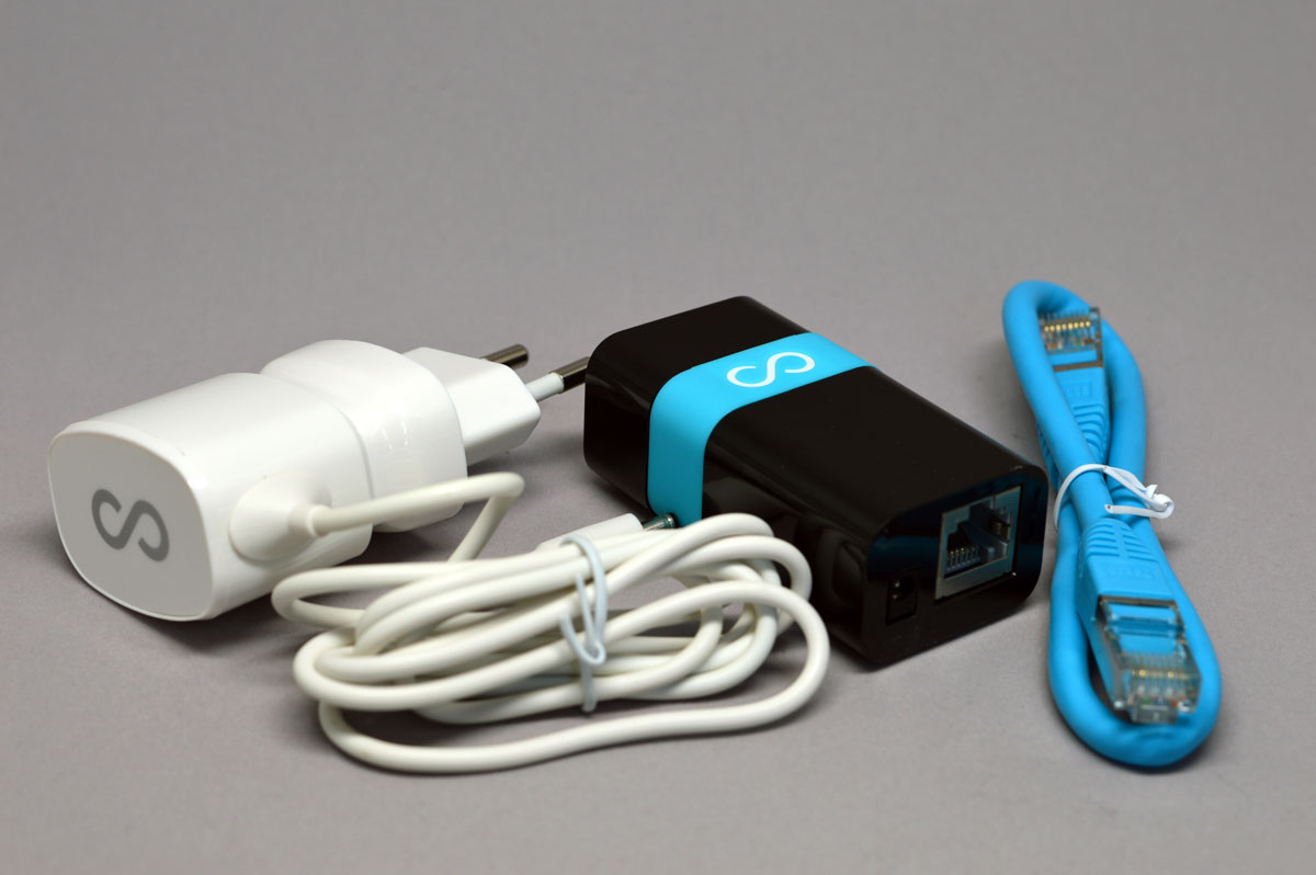 Le boîtier Lima était disponible à un prix très attractif sur Kickstarter, on pouvait donc l’obtenir pour environ 80 euros. Lors de sa sortie, son prix passera à 149 euros. Faisant parti des personnes ayant financé Lima, j’ai donc reçu avec mon boîtier une paire d’écouteurs. Lima s’accompagne d’un câble Ethernet de la couleur du boîtier et d’un adaptateur secteur. Il dispose d’un unique port USB pour mettre une clé USB ou un disque dur externe par exemple. Cependant, au moyen d’un hub il est possible de rajouter autant de disques qu’on le désire. Dans la FAQ, il est précisé qu’ils ne garantissent pas les performances au-delà de 7 To, ce qui est déjà pas mal.