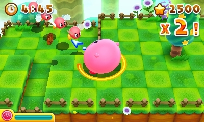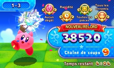 Au niveau du gameplay, le jeu est très simple et reprend les mécaniques des anciens jeux : on saute/vole, on avale et on recrache les ennemis. Cependant, le plus important dans ce jeu, c’est de scorer ! En effet, en avalant un ennemi, il faudra le recracher sur un autre afin de monter la chaine de combos. Pour augmenter son score, il faudra aussi récupérer les 4 médailles : finir le niveau sans se faire toucher, le terminer rapidement, avoir tué tous les ennemis, et enfin avoir récupéré toutes les pièces. A la fin du niveau, on se voit gratifier d’une coupe en bronze, argent, or, platine. Les 3 derniers meilleurs scores sont affichés aussi.