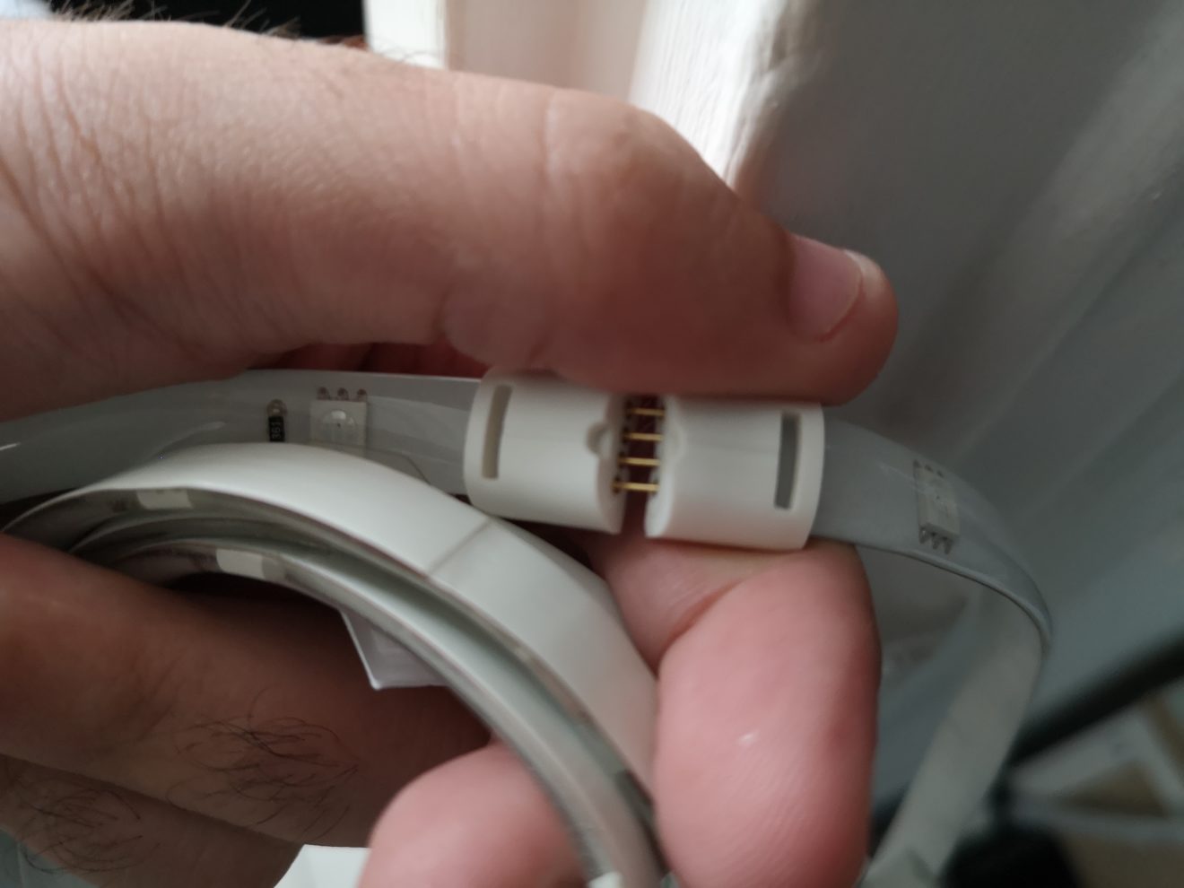 Tout d’abord, on déroule la bande LED et on choisit où l’installer. On retrouve du scotch double-face déjà appliqué sur la bande. Une fois collé, il est possible de couper la bande pour ne pas avoir un morceau qui dépasse ou alors de rajouter de la longueur (jusqu’à 10 mètres).