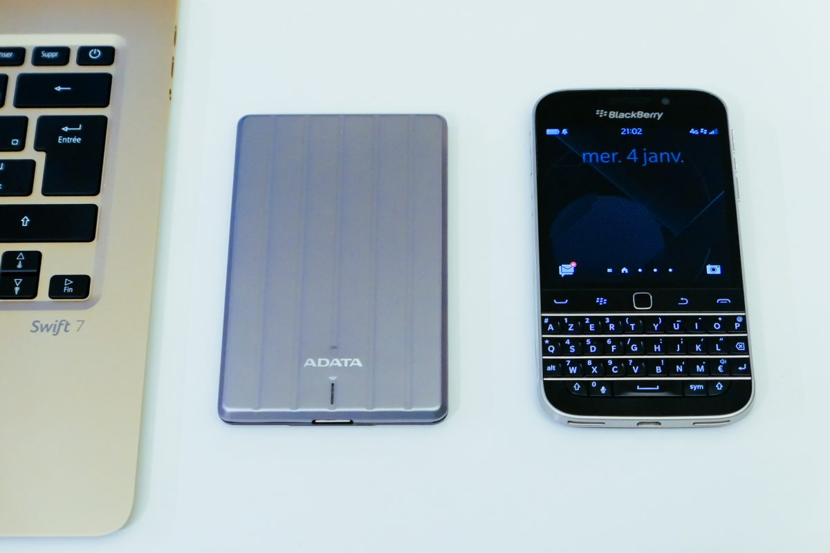 Comme je le disais, j’ai choisi la version 2To du HC660, sachant qu’il existe une version 1To. De couleur titane, le métal du dessus du boitier est agréable en main, le dessous étant lui en plastique noir. Comme vous pouvez le voir ci-dessous, il est plus petit qu’un smartphone classique (un Blackberry Classic dans le cas présent) et il est tout léger : 124g. Et super slip : 9,6mm…! Au niveau de l’interface on a droit à de l’USB 3.0. Autant dire que ça booste pas mal. Bien entendu ce SSD est compatible avec l’USB 2.0. Etant dorénavant sous Windows 10 avec mon ordinateur portable, mais toujours sous macOS 10.12 (Sierra) avec ma machine de prod, je n’ai aucun soucis pour utiliser le petit ADATA sur l’un ou l’autre ordi (avec un petit tour par Tuxera sur le Mac pour pouvoir écrire sur une partition NTFS… les concernés comprendront).