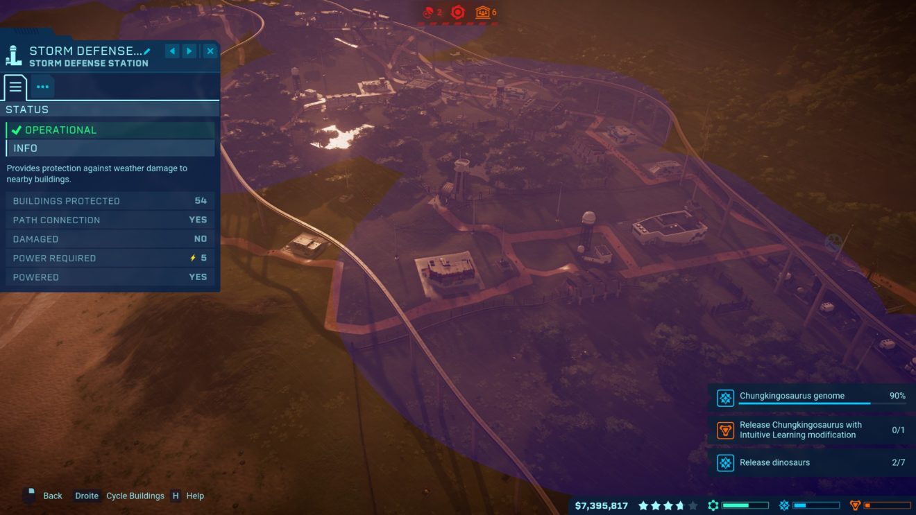 D’autre part, les cinq îles sont situées dans une zone tropicale, qui peut être sujette à des …tempêtes. Ces tempêtes peuvent mettre à mal votre parc, vos infrastructures, et vos visiteurs. C’est le petit côté random de Jurassic World: Evolution, tout va très bien, et d’un coup, des trombes d’eau, des générateurs qui tombent en panne, des barrières sans courant, des dinosaures qui se sauvent… bref vous connaissez le reste 🙂