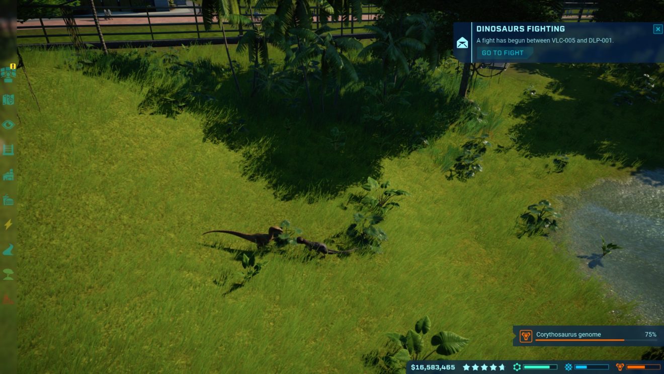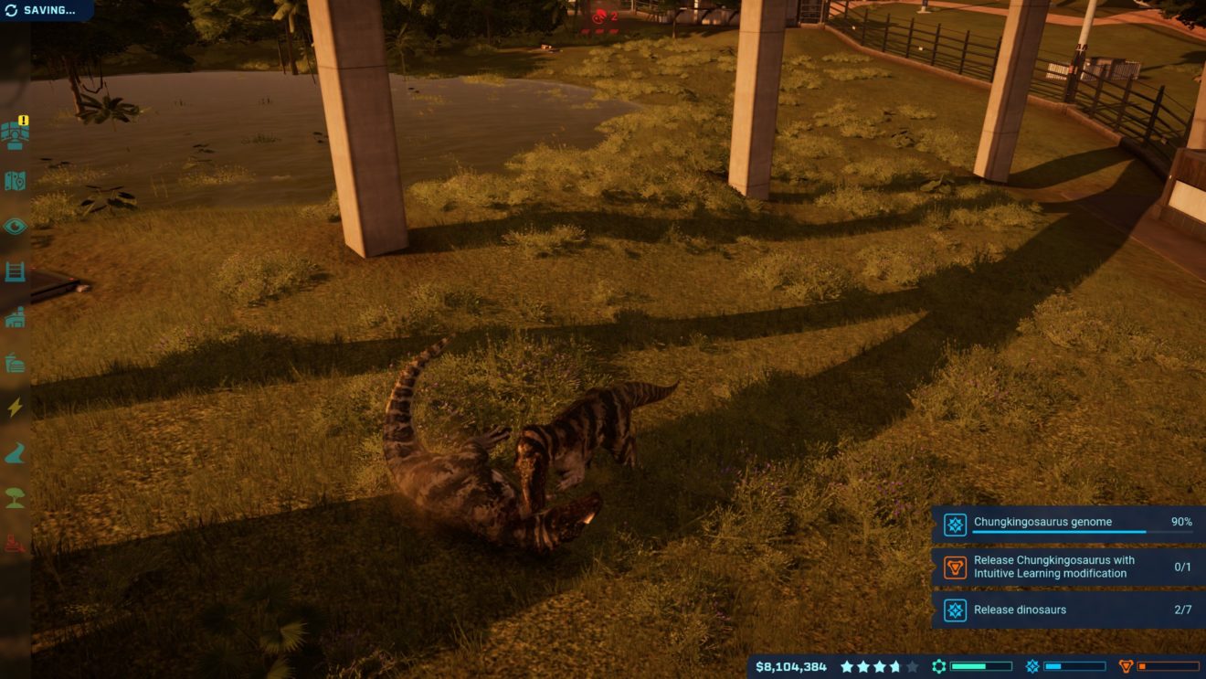 Dans  le jeu, ça se répercute  dans le fait que vous pouvez altérer des branches d’ADN pour donner des caractères spéficiques à vos dinosaures: changement de couleur, agressivité, meilleure digestion, intelligence plus développée, griffes plus dures, régénération cellulaire plus rapide… Tous ces attributs offriront au public de nouvelles choses, et surtout, feront venir plus de gens ! Par contre, les animaux, eux, verront leur espérance de vie baisser, et surtout, risquent de mourir pendant le processus de clonage beaucoup plus souvent. Alors un Indominus Rex violet fluo c’est cool, mais vu le coût de création du bestiau, est-ce que perdre plusieurs millions de dollar sur un caprice du destin vaut le coup ? C’est vous le boss.