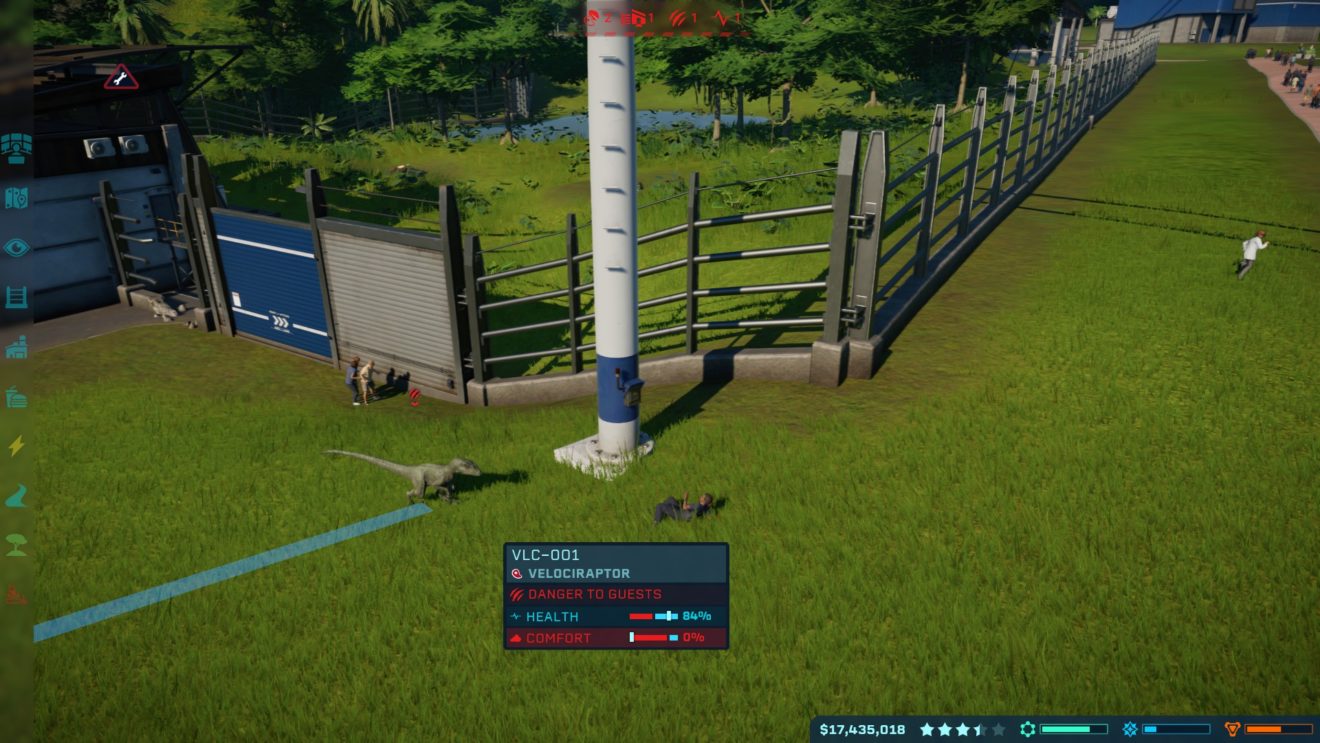Hé oui, on l’oublie, mais les dinosaures sont des animaux vivants, avec des besoins,  des attentes… Certains péteront un câble à cause de la promiscuité, certains ont besoin de beaucoup de broussailles, ou d’arbres… Élever une certaine race de dinosaures aura pour conséquence de bien penser à vos constructions, en fonction de la surface à laquelle vous avez accès. Sinon, vous aurez beau construire des abris, les dinos auront toujours le temps de tuer quelques visiteurs avant que l’ ACU réagisse et endorme la bestiole.