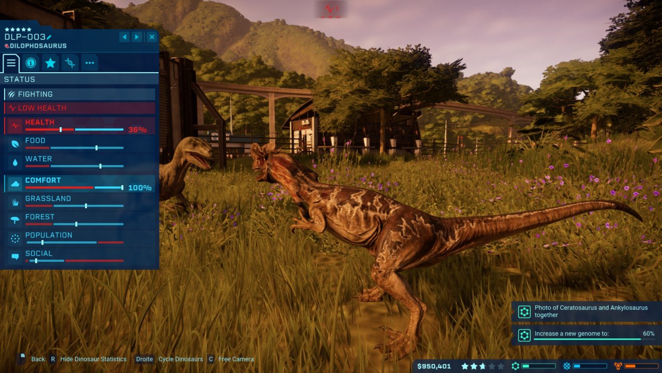 Cela remplira leur barre d’ADN, qui une fois remplie à 50%, vous permettra de créer ledit dinosaure. Plus la jauge d’ADN sera complète, plus le dinosaure aura de chances d’émerger vivant lors de son processus de clonage (car oui, un manque de matériaux génétiques fiables impactera la santé, la durée de vie et la customisation des dinosaures).