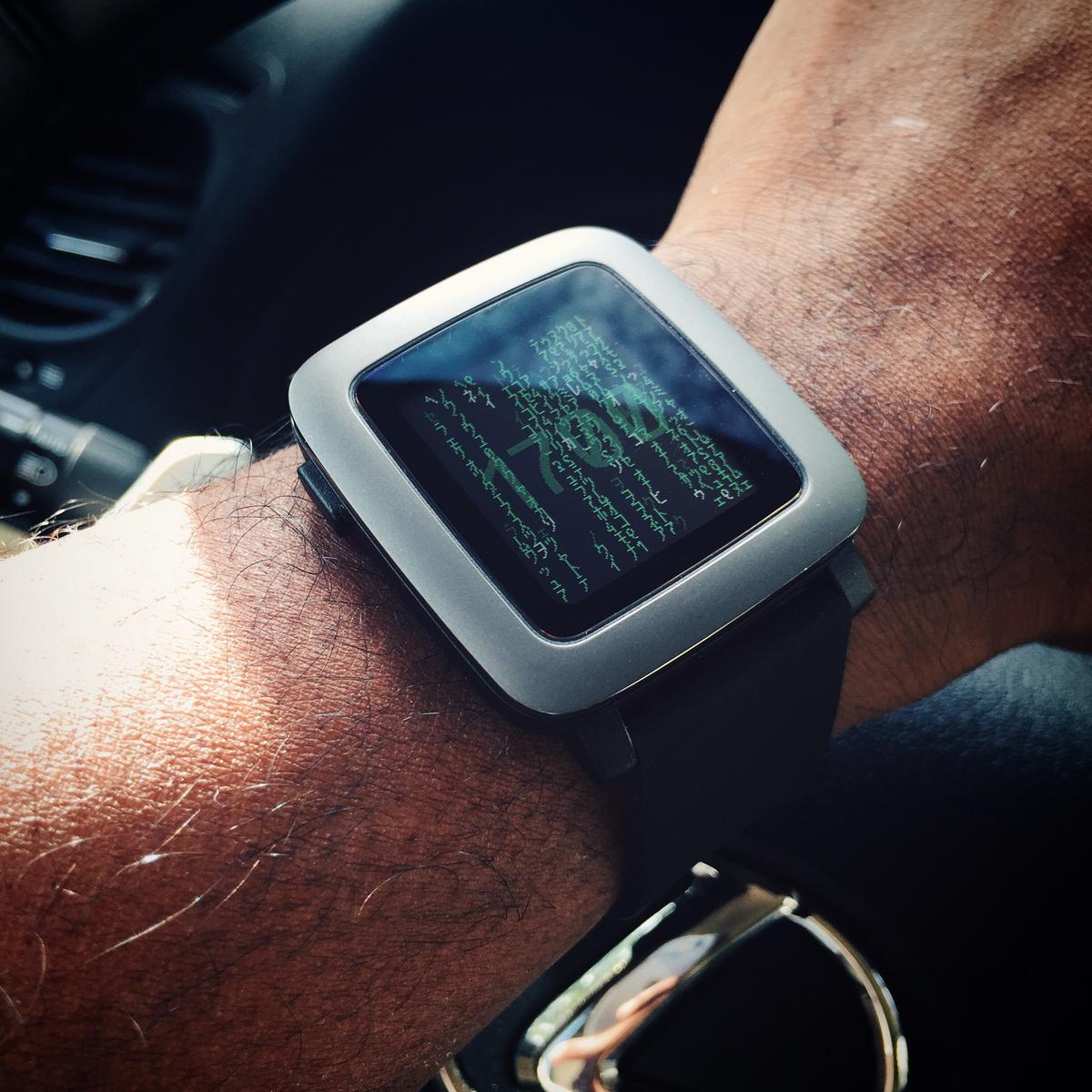 J’évoquais quelques lignes plus haut les Watchfaces. Il s’agit en fait de l’écran d’accueil de la Pebble qui reste constamment activé et visible. Il existe sur l’app store de Pebble (accessible depuis l’application que vous aurez installé sur votre smartphone) des centaines de Watchfaces : cela va de la réplique de montre Casio à un Nyang Cat animé qui donne l’heure en passant par mon fameux écran Matrix. Il y en a vraiment pour tous les goûts.