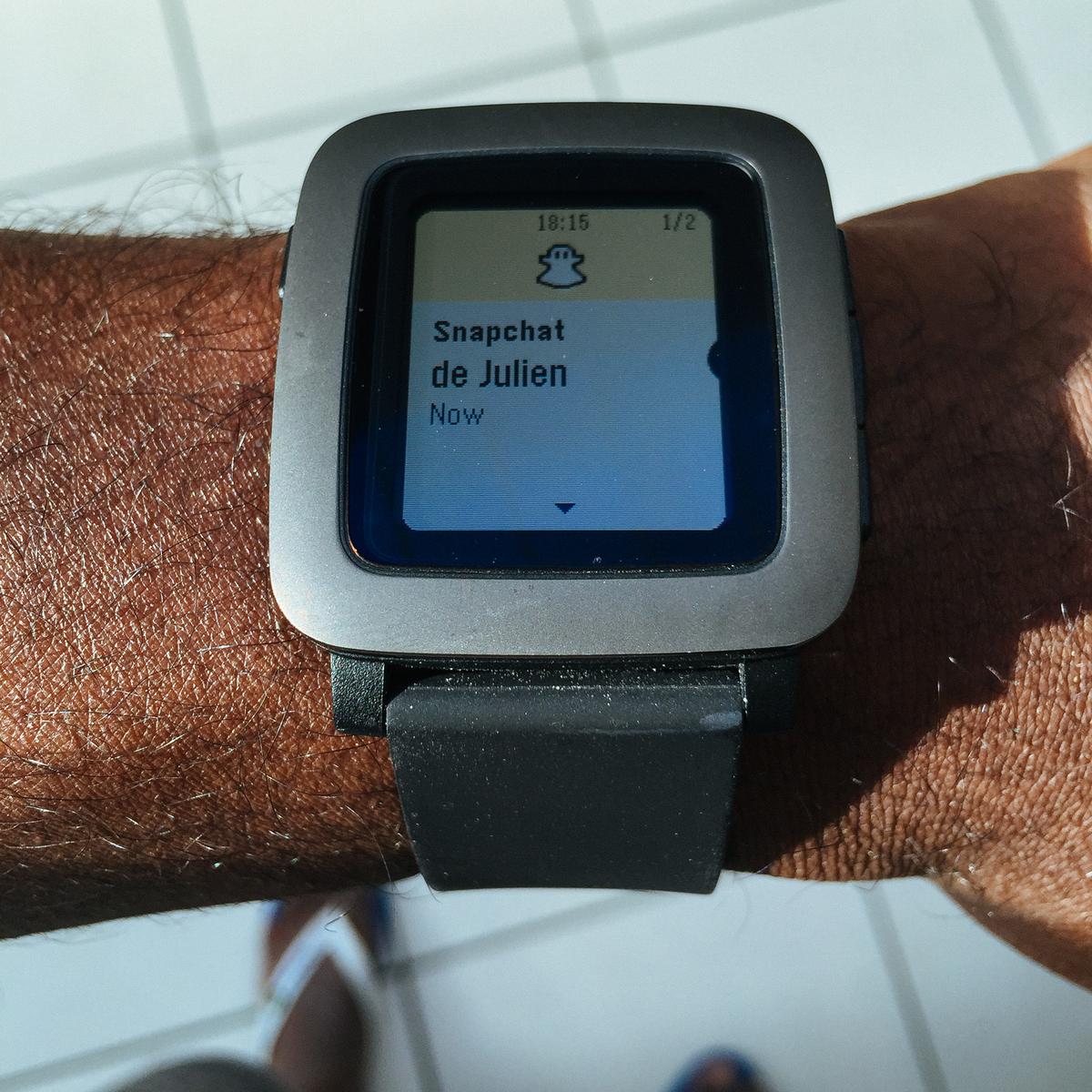 Une des fonctionnalités de base d’une smartwatch, c’est justement le fait de pouvoir recevoir les notifications de son smartphone directement sur sa montre. La Pebble Time le fait très bien, avec une petite animation contextuelle selon l’application concernée. Par exemple elle affichera une notification jaune avec un petit fantôme lorsque vous recevrez des notifications en provenance de Snapchat. Il faut toutefois faire un peu attention aux notifications qui s’affichent sur votre téléphone car ce sont exactement les mêmes qui s’affichent sur la Time. Pour ma part je désactive par exemple le contenu des SMS. Je reçois juste « Message reçu de la part de Hadrien », histoire que les collègues ne soient pas à l’insu de leur plein gré (« ça s’est affiché, j’ai lu ! ») au courant des blagues geek coquines envoyées par mon ami (il en a de bien bonnes je dois l’avouer).