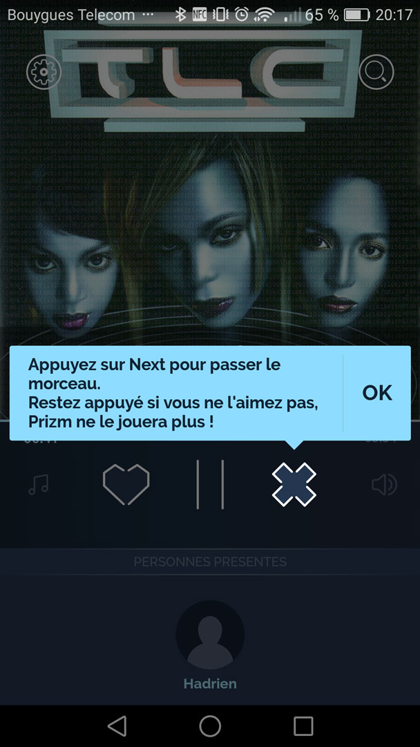 On retrouve les mêmes actions que sur le boîtier. C’est à dire que je me contente de laisser l’appareil choisir et je n’ai plus qu’à aimer (appui sur le cœur) ou à passer à la suite (appui la croix). Le son se gère au milieu grâce à une bande tactile et le bouton tout en bas permet de mettre en pause ou d’éteindre le Prizm.