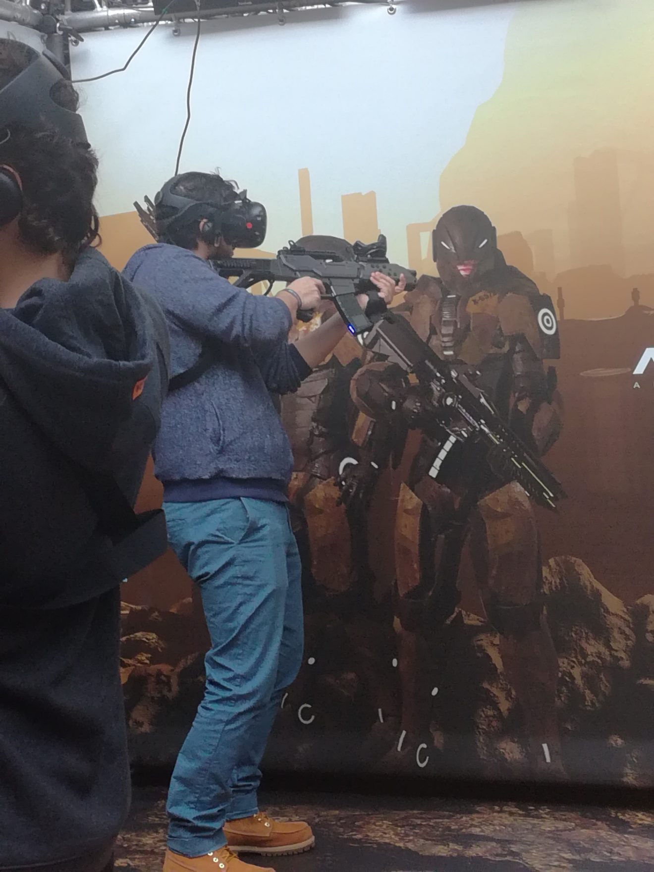 Alors que le concept est alléchant, je déchante assez vite : La prise en main est moyennement aisée (commandes de déplacement type « ZQSD » sur un joystick latéral au fusil, direction donnée par le casque) et surtout la visée me semble approximative, alors qu’elle est censée être la plus intuitive du monde : lever son fusil, aligner le point rouge, tirer. Et là c’est le drame: je me fais absolument latter la face. Je galère à me déplacer (je butte sur les murs, je tombe des passerelle étroites), mes tirs partent complètement à côté, à tel point qu’en bon gamer je commence à me demander si mon matos est bien réglé. Mais passons, acceptons 5 min que j’ai été simplement mauvais : ce que j’avais vu sur les parties précédentes sur les écrans de spectateurs m’avait alléché, c’était beau, fluide, etc. Une fois le casque sur les yeux, dans des condition de compétition, je me heurte à une bouillie de pixel, je distingue mal mes ennemis, je les aligne comme un mauvais chasseur, quand je ne suis pas en train de remettre mon fil de casque dans mon dos pour ne pas m’étrangler avec.
